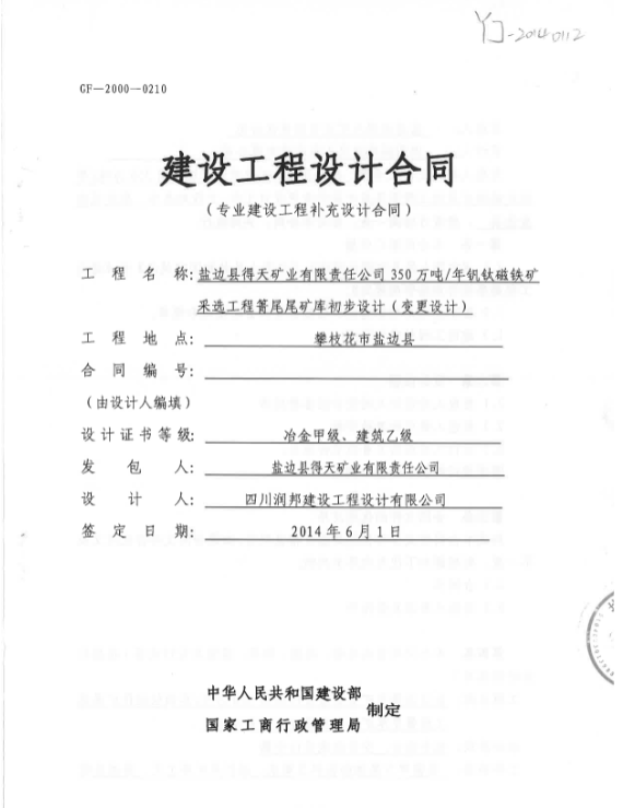 鹽邊縣得天礦業(yè)有限責(zé)任公司350萬噸每年釩鈦磁鐵礦采選工程箐尾尾礦庫初步設(shè)計(jì)(變更設(shè)計(jì))